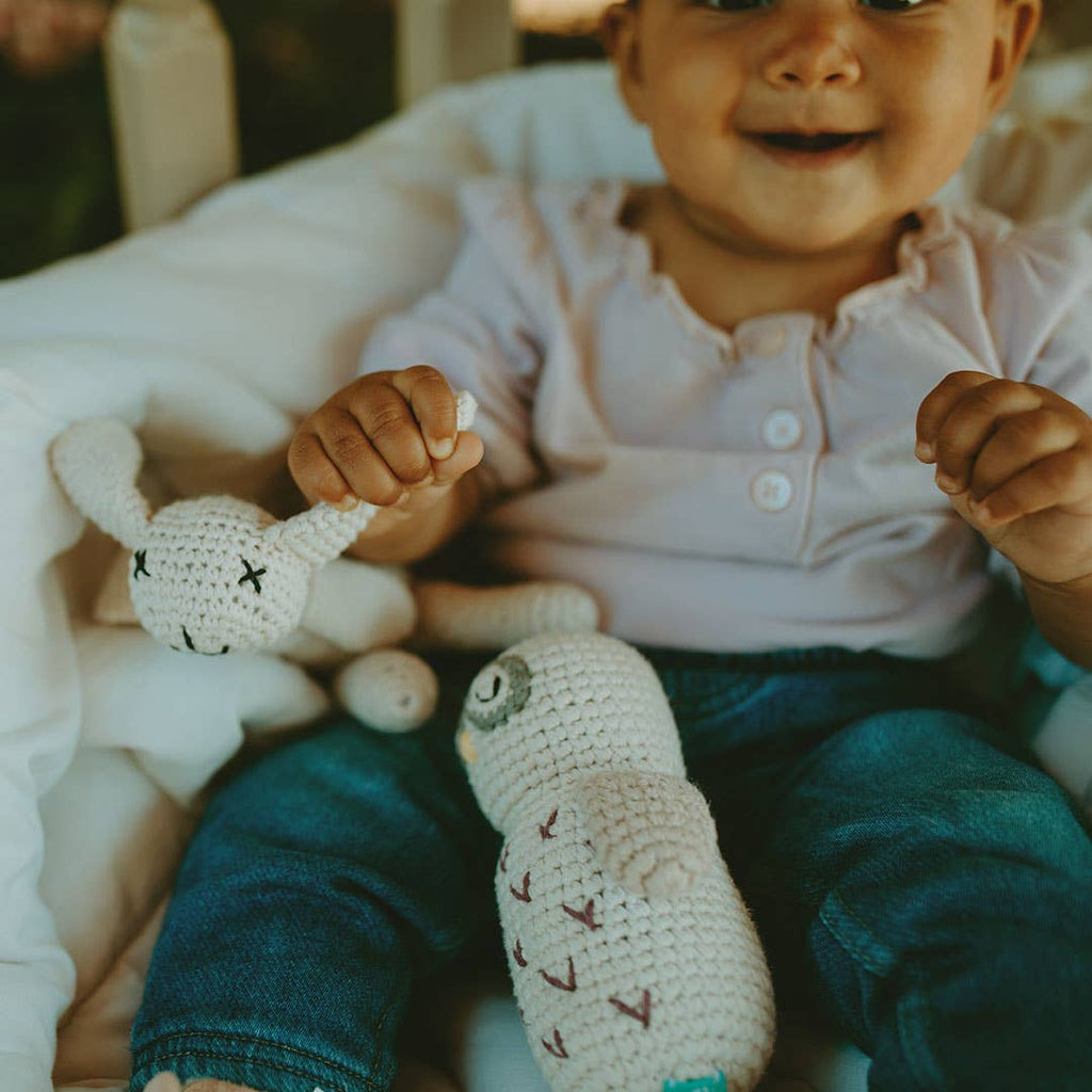 The neutral colors of this stuffed animal make it the perfect add on to baby shower gifts. Guaranteed to capture the hearts of shoppers of all ages. Fair Trade. Handmade. Durable & washable.