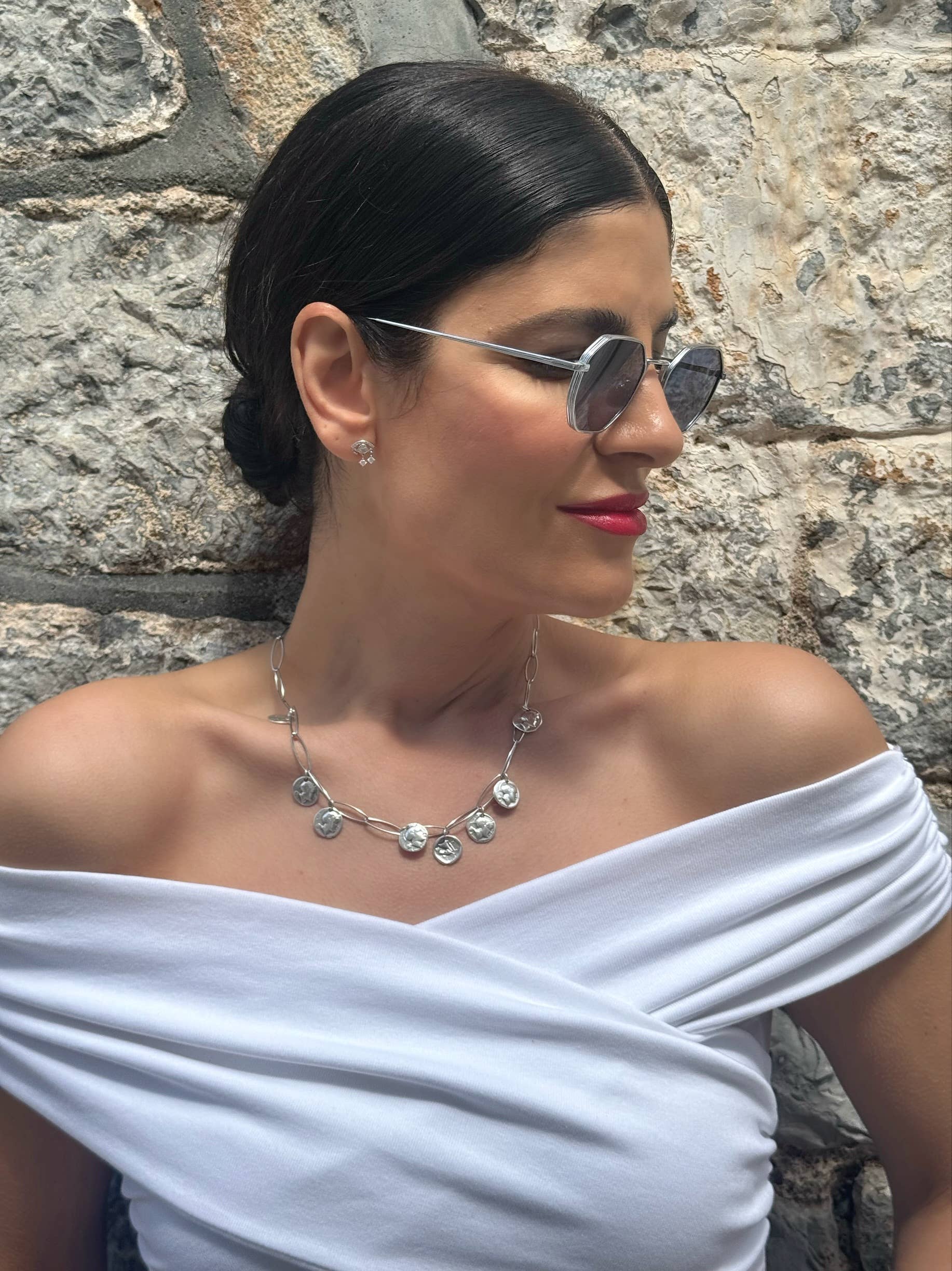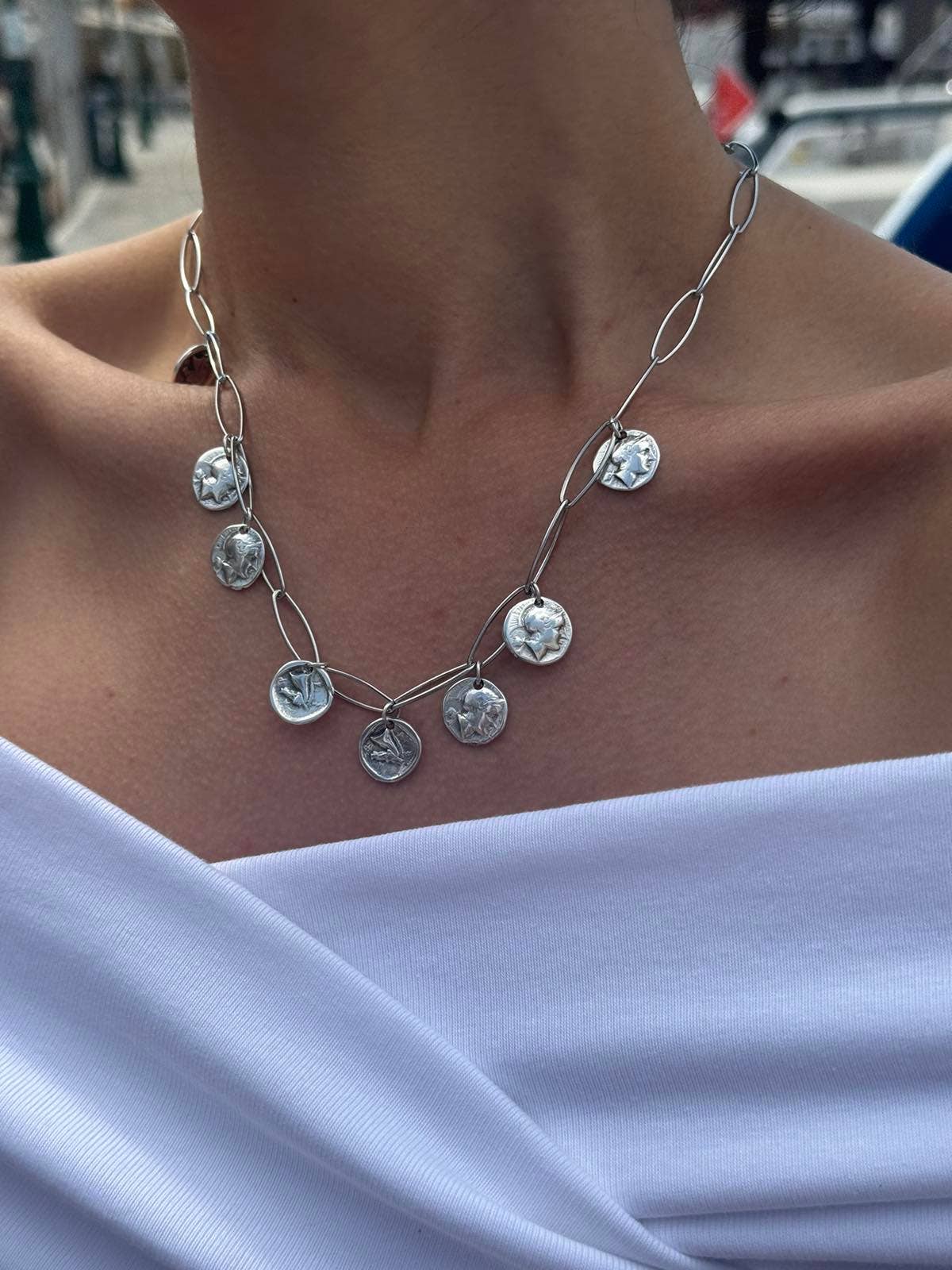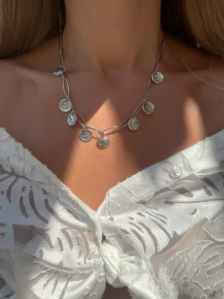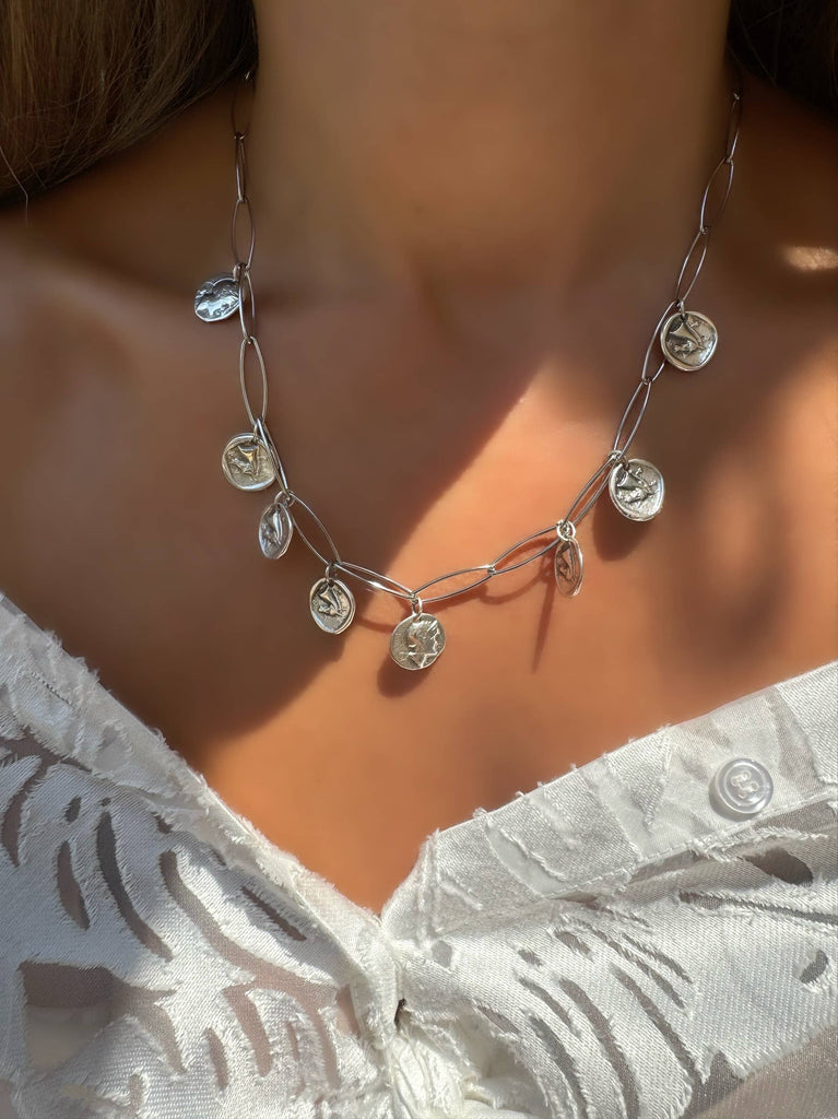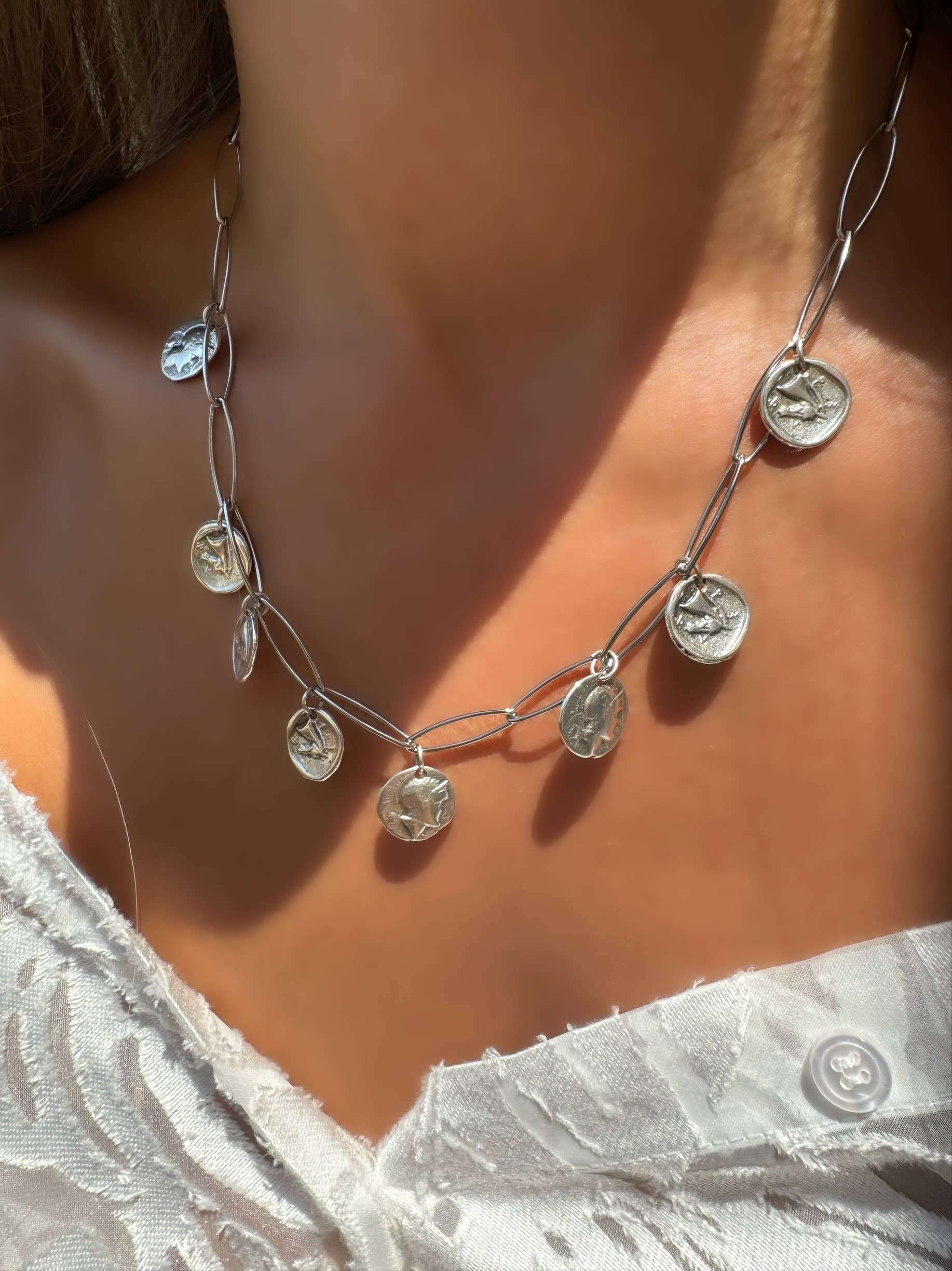 Introducing our exquisite Vintage Silver Necklace, a timeless piece exuding elegance and charm. Crafted from sterling silver, this necklace features a delicate chain adorned with intricately designed vintage coins, offering a truly unique and versatile accessory. Elevate your style with this exclusive pendant, available now at Christina Christi Store. MATERIALS - Chain is made from Stainless Steel. - Metal Coins. DIMENSIONS - Silver Discs Necklace, has length 46cm (18.1'') PROTECTION - Protect them from water, parfumes, hair and body lotion to keep them bright and shiny for years.
