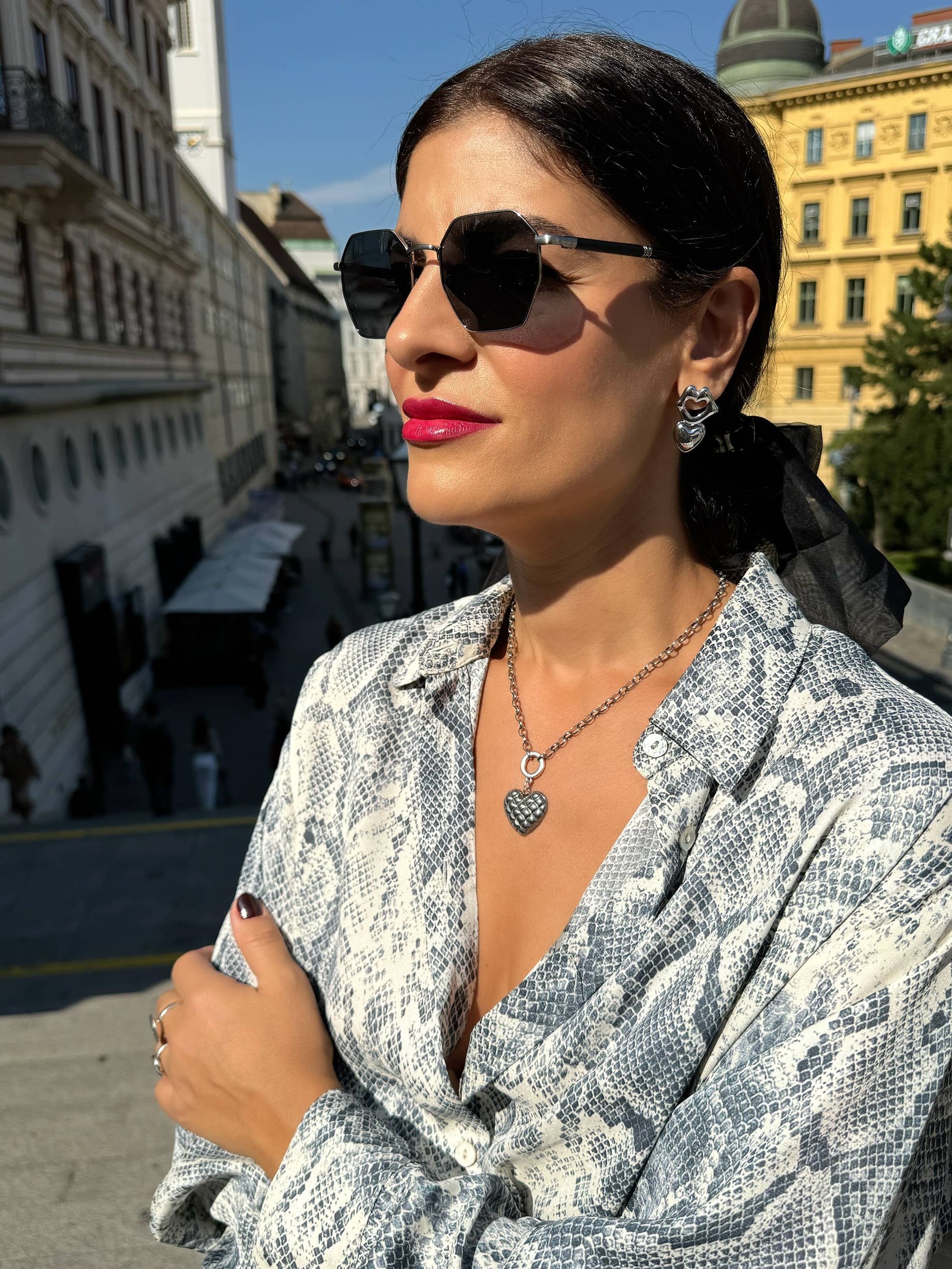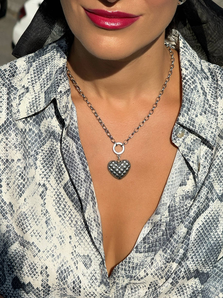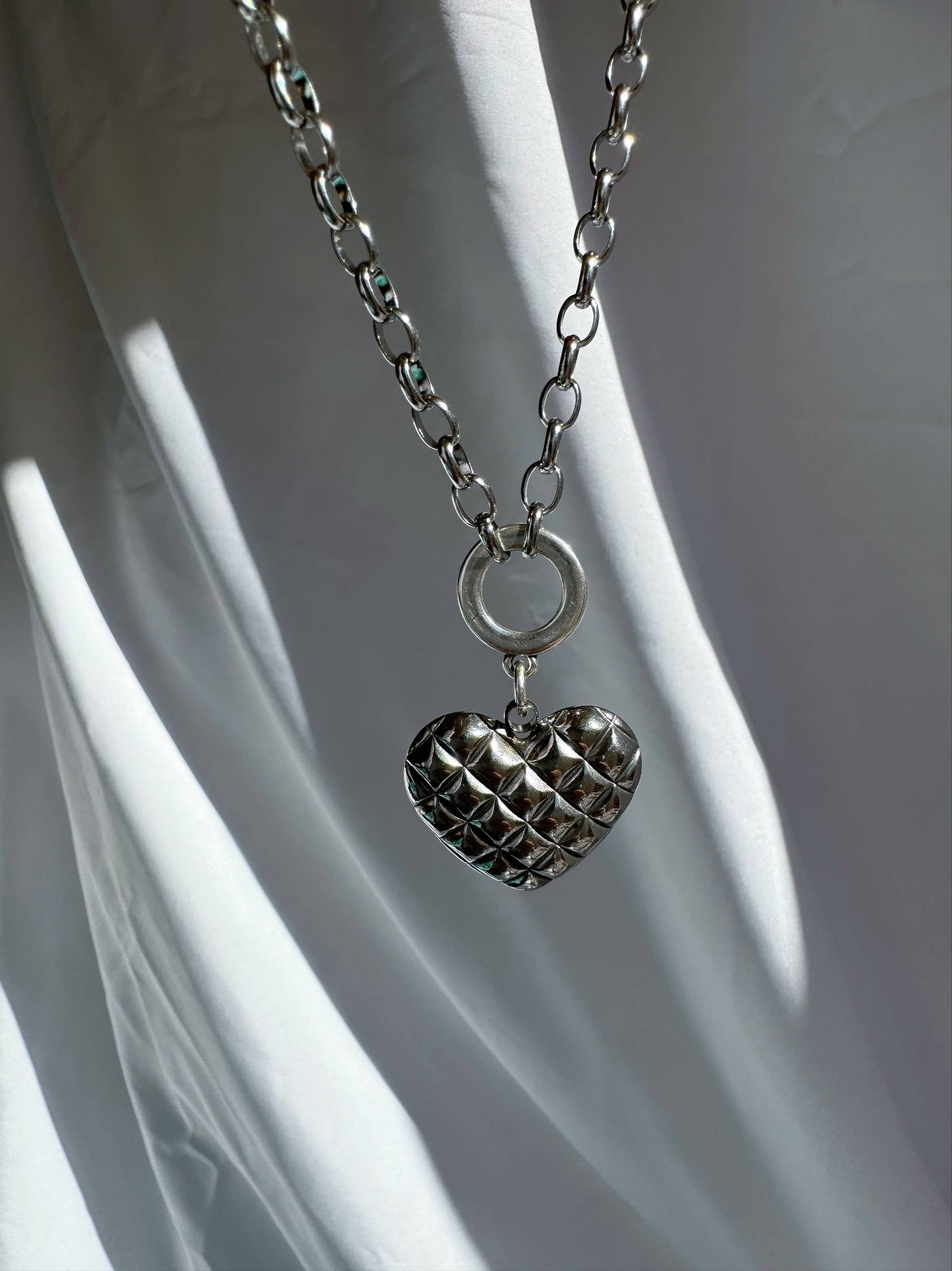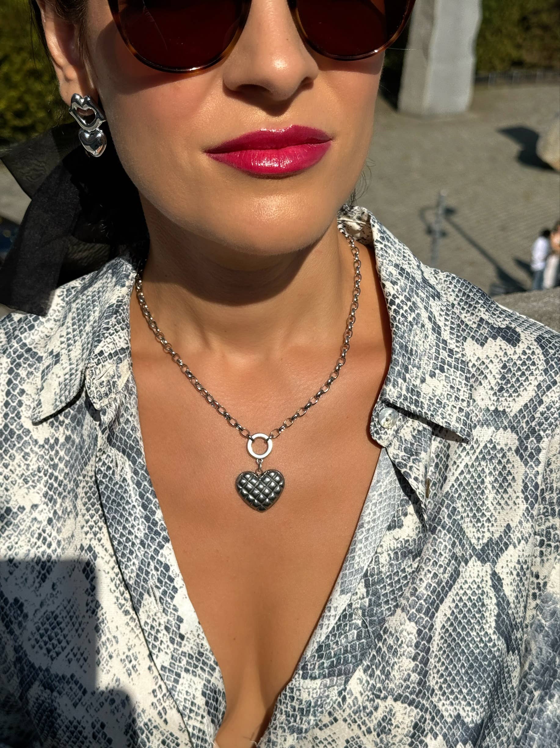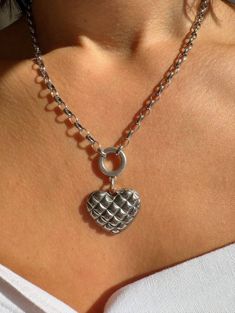 Crafted by hand, this silver pendant features a one-of-a-kind heart charm adorned with delicate engraved lines, elegantly secured by a silver disc for a distinctive look. The necklace chains, also crafted from stainless steel in a silver hue, create a slightly adjustable piece that perfectly complements any style, making it an ideal fit for any woman's neckline. MATERIALS - Chains are made from Stainles Steel. - Heart charm Is made from pewter. DIMENSIONS ​- Heart necklace (14,5 x 15,6 mm) has length 46 cm (18.11'') (Slightly Adjustable) PROTECTION - Protect them from water, parfumes, hair and body lotion to keep them bright and shiny for years.