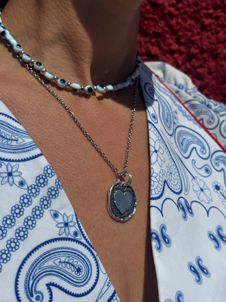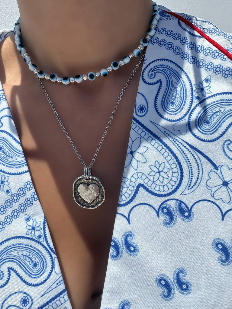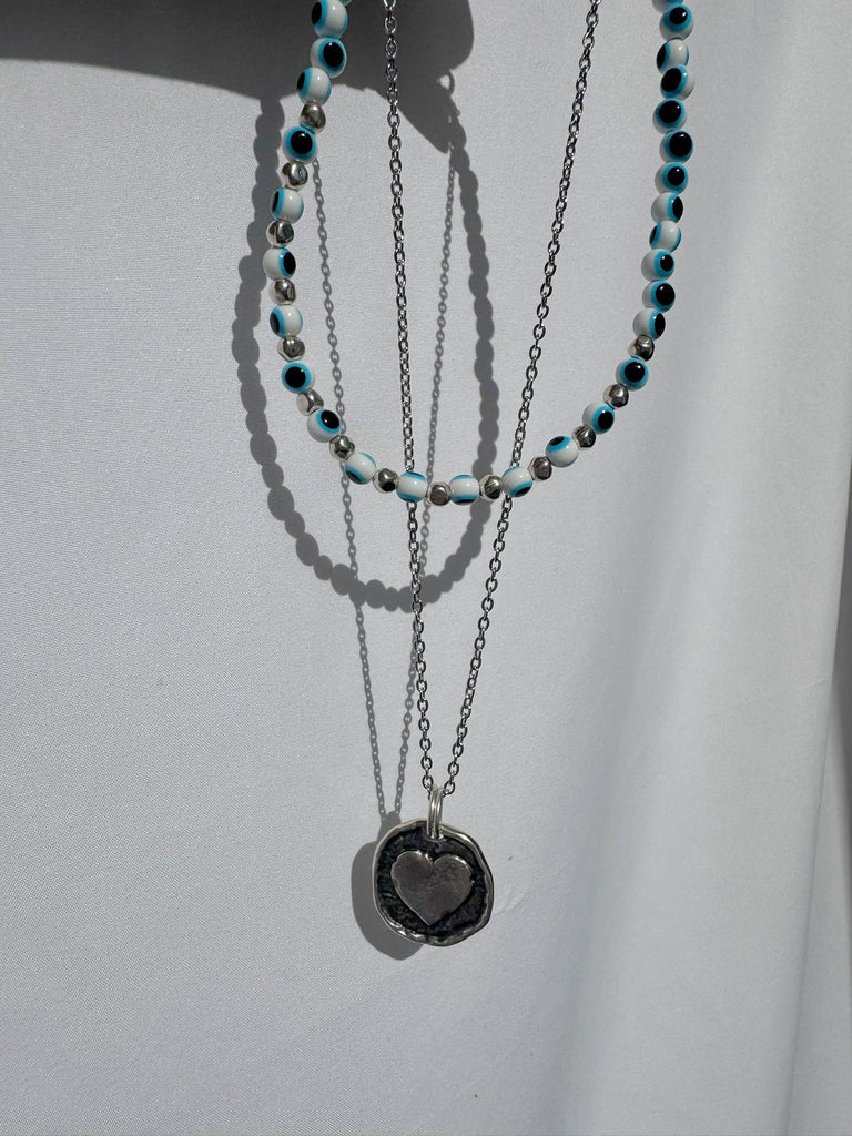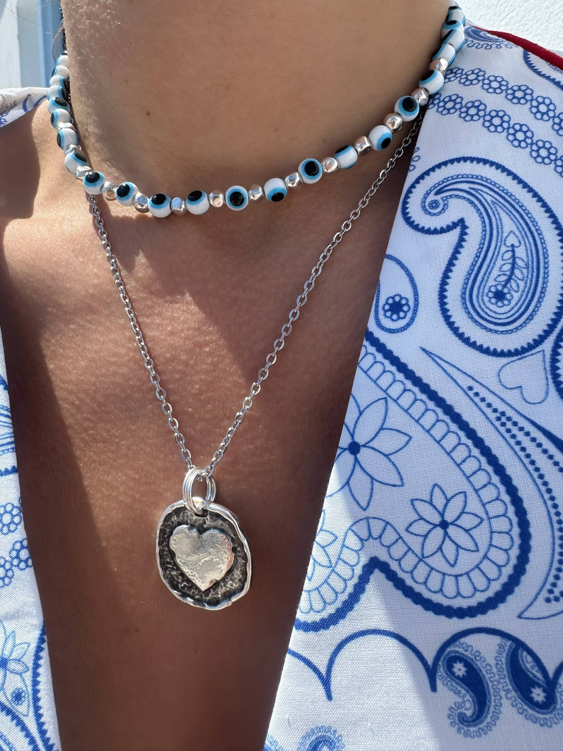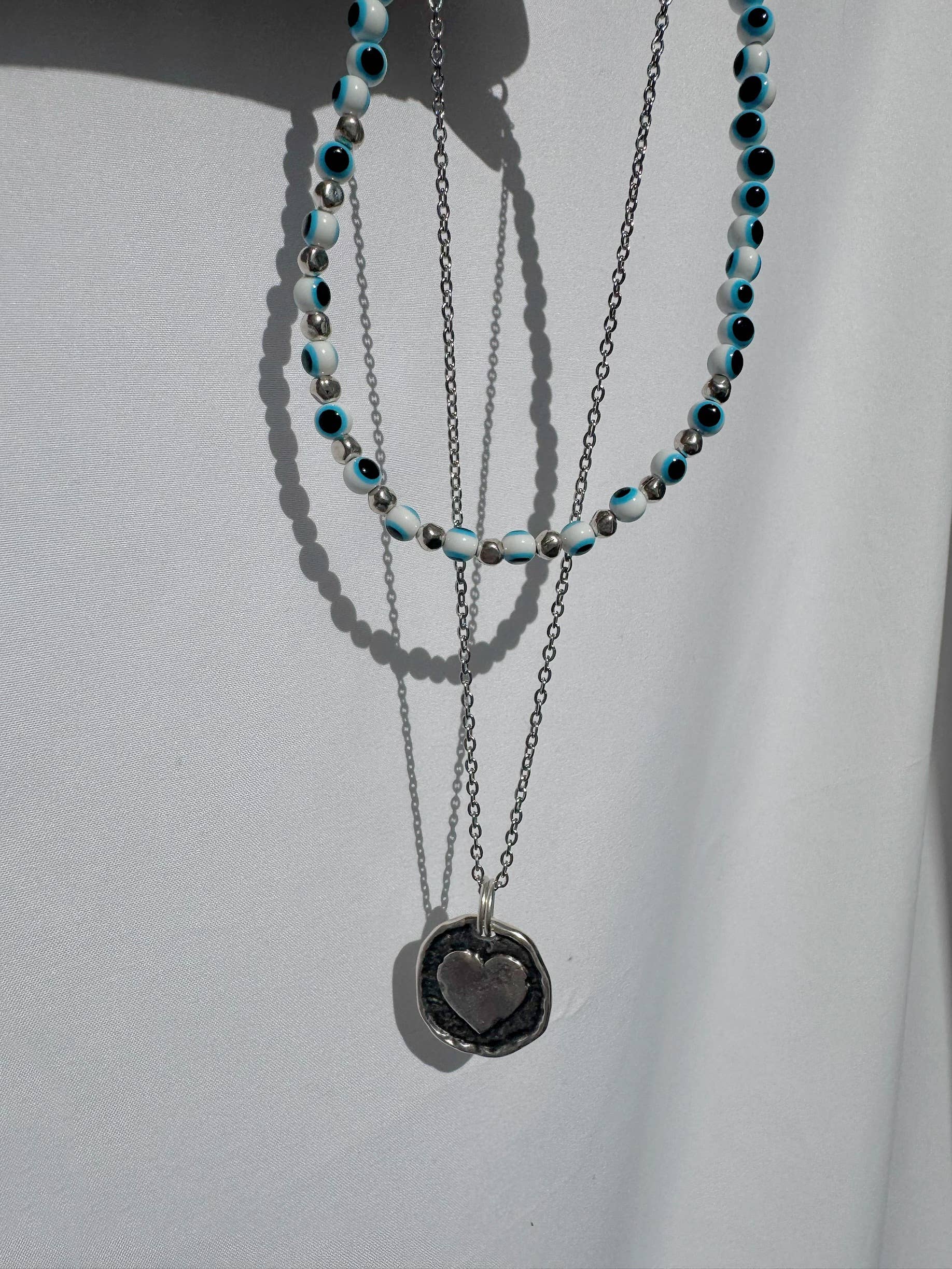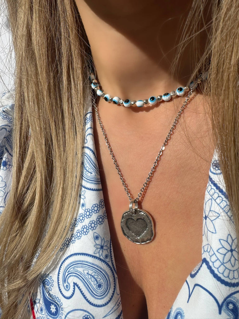 A handmade necklace set with a glass evil eye choker and a stainless steel heart pendant. Bold, protective, and perfect for summer displays or gifting collections.