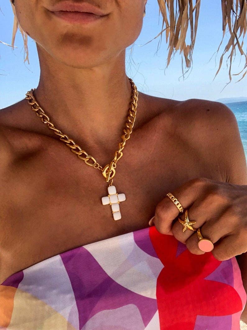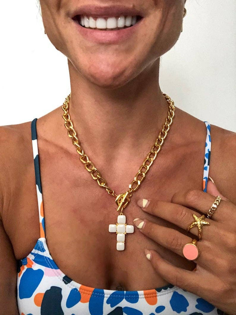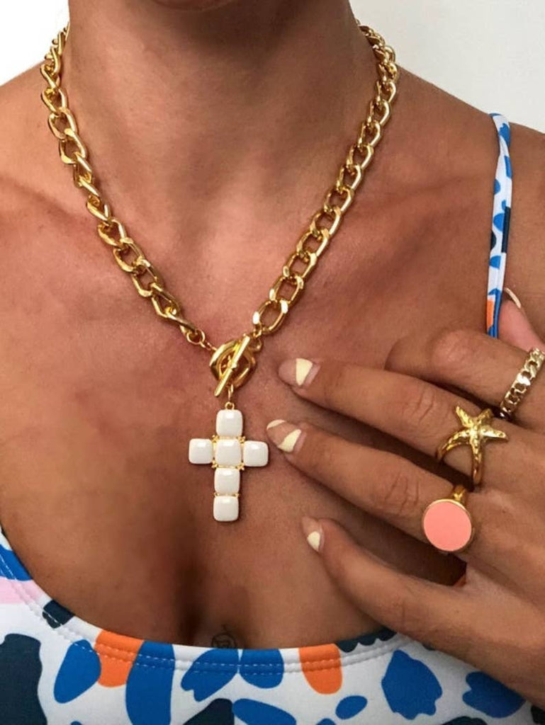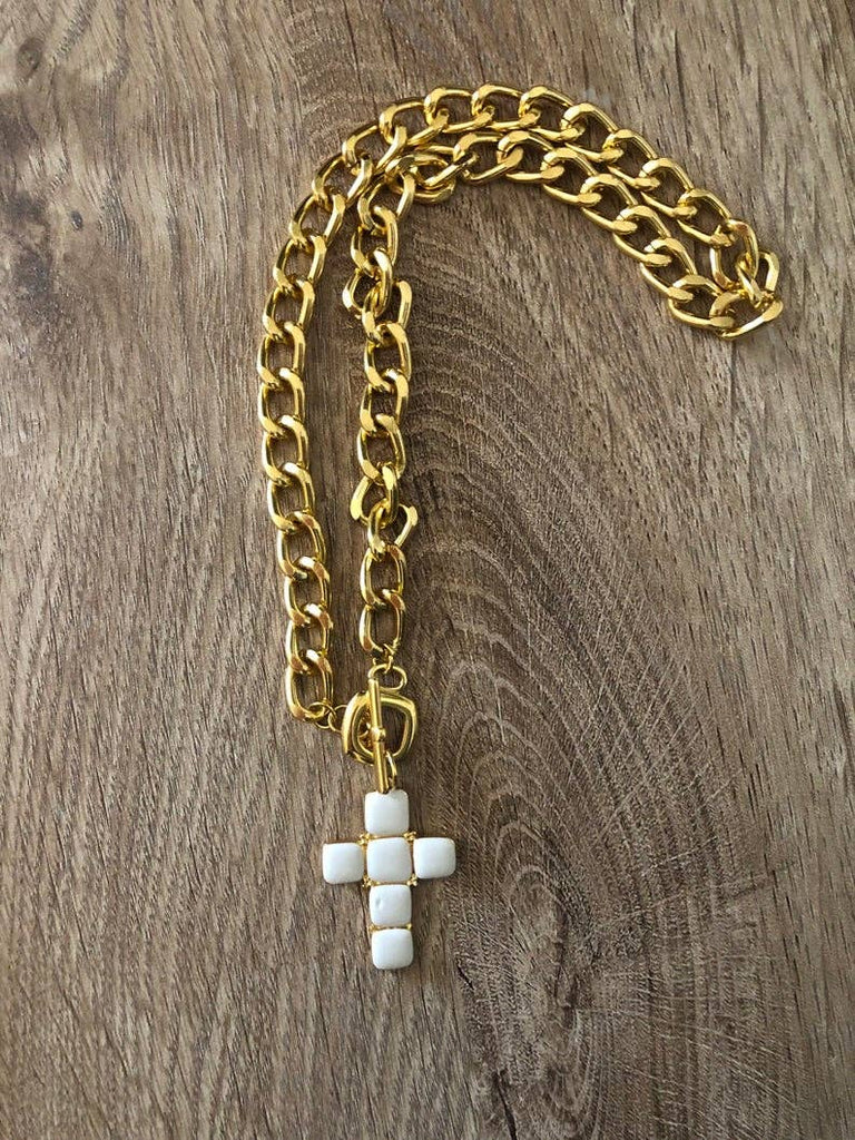 White Stone Cross Necklace with Gold Chain