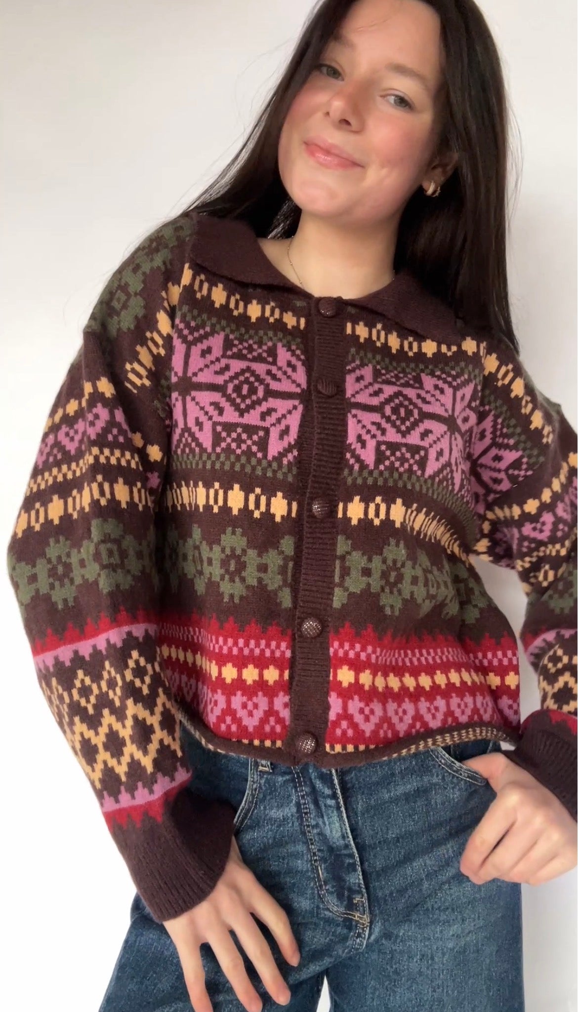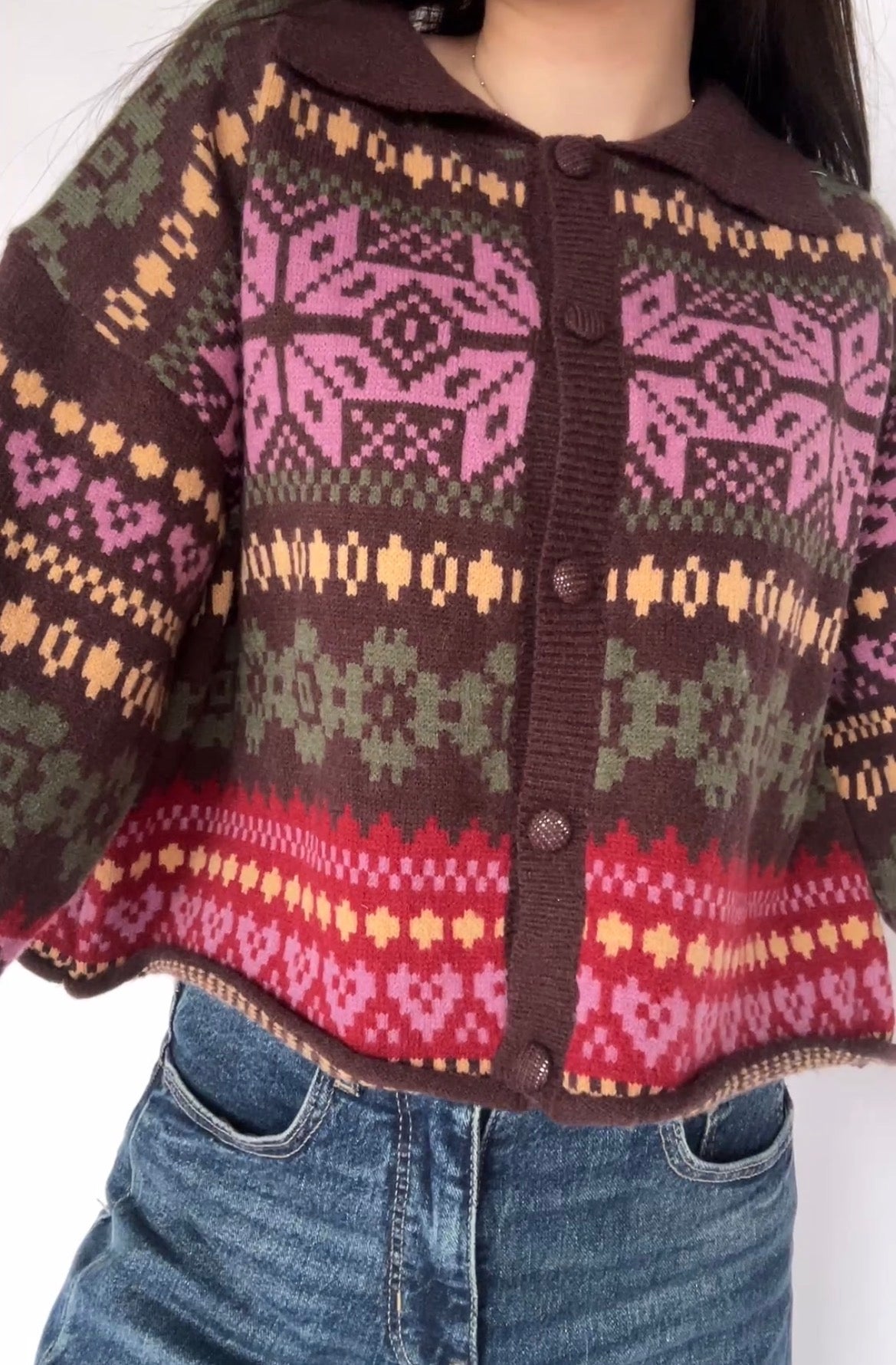 Fair isle sweater cardigan in dark brown