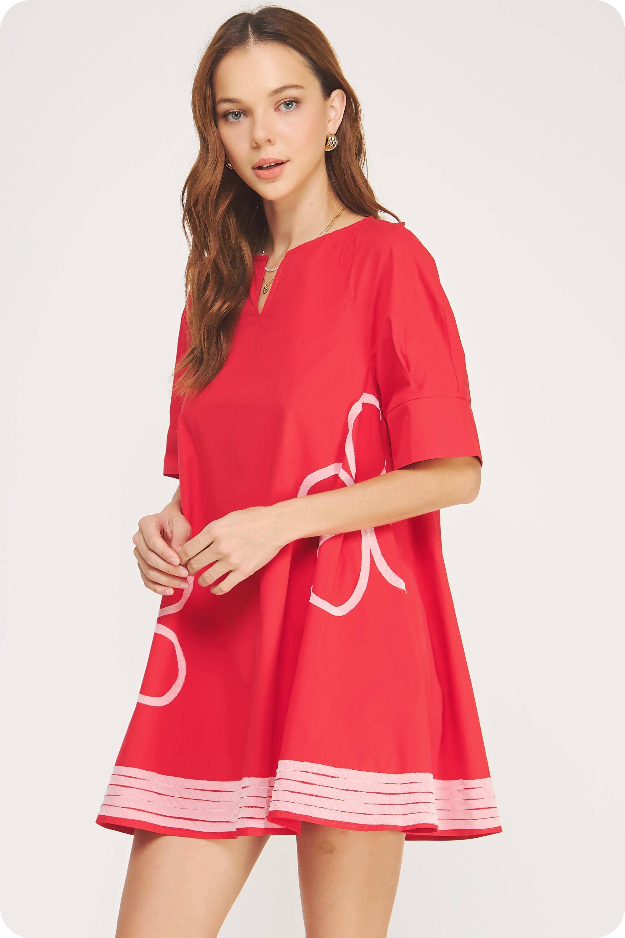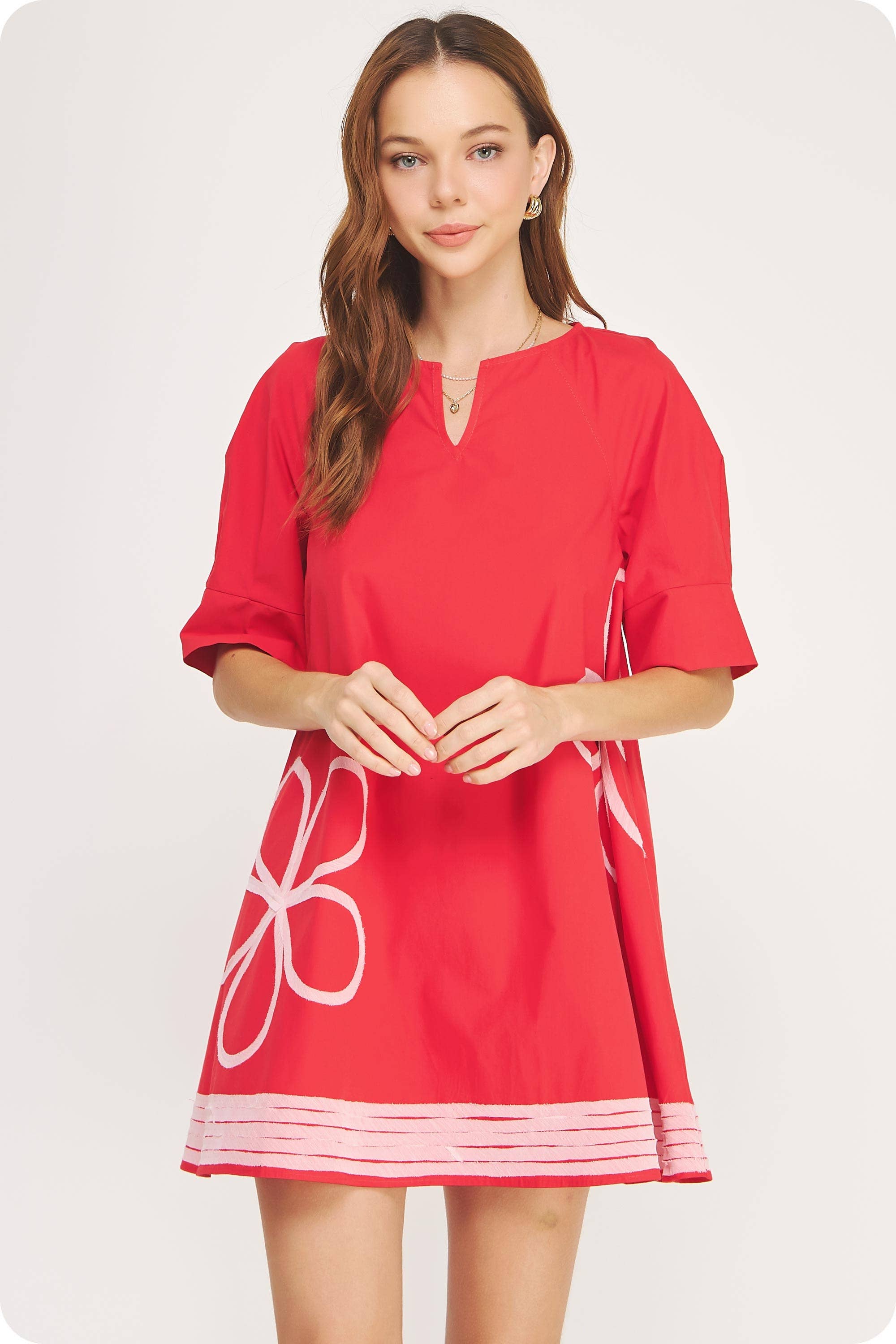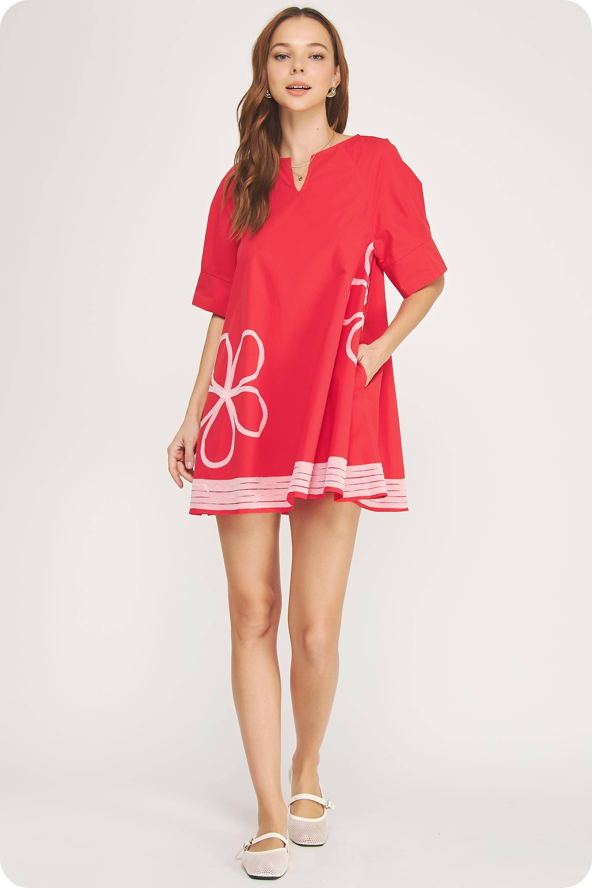 Contrast Frayed Trim Red Flower Detail Poplin Mini Dress