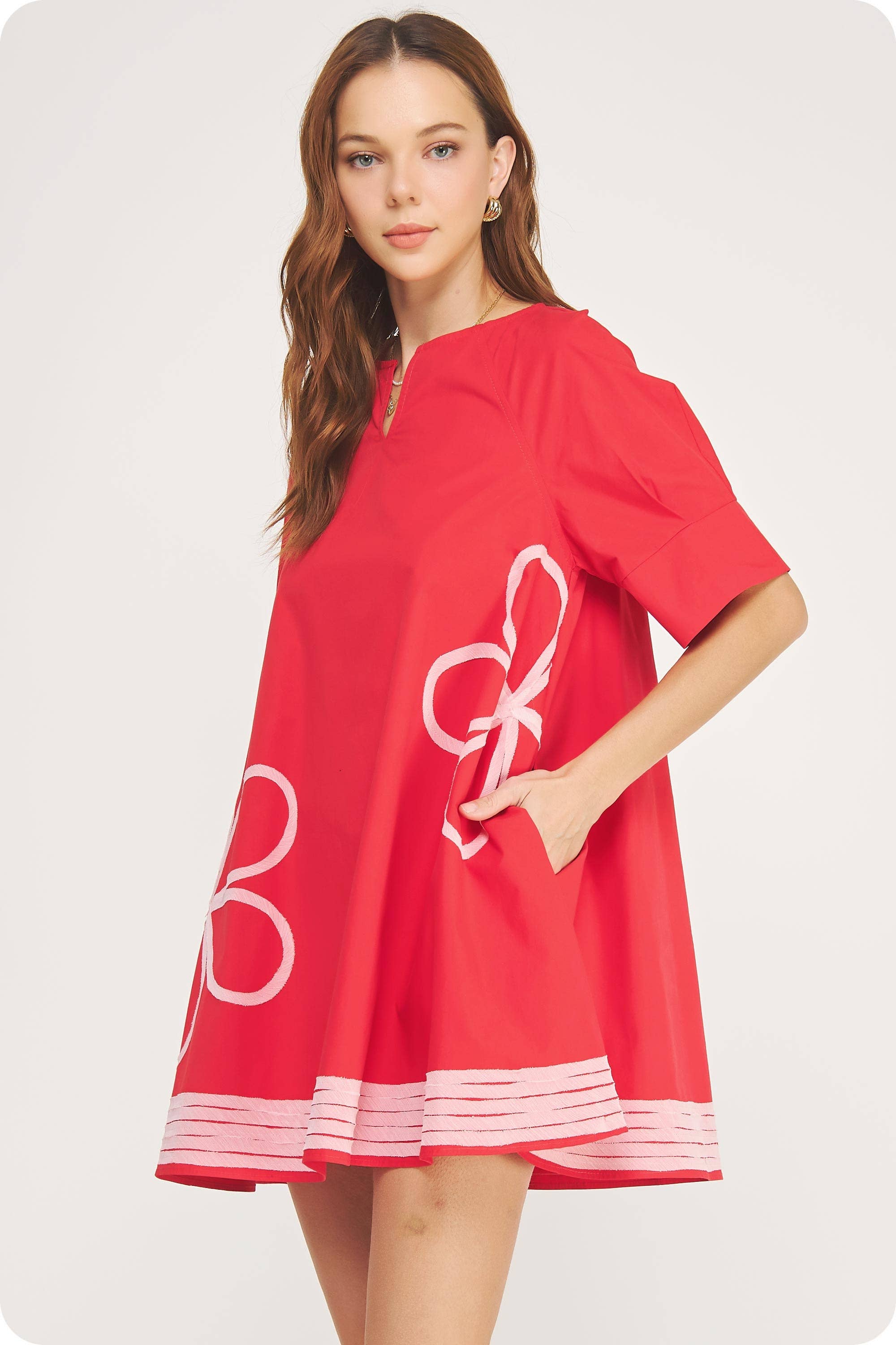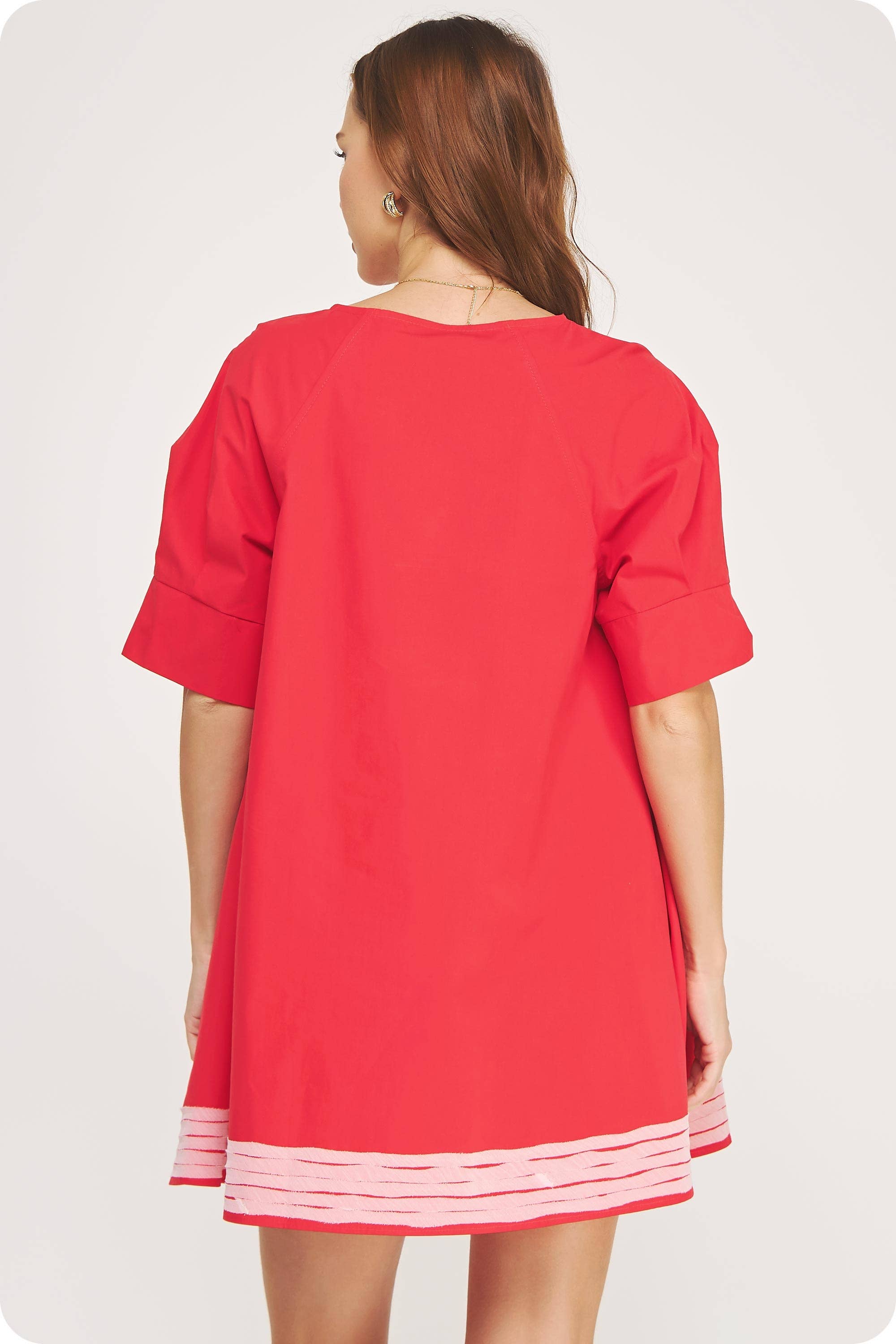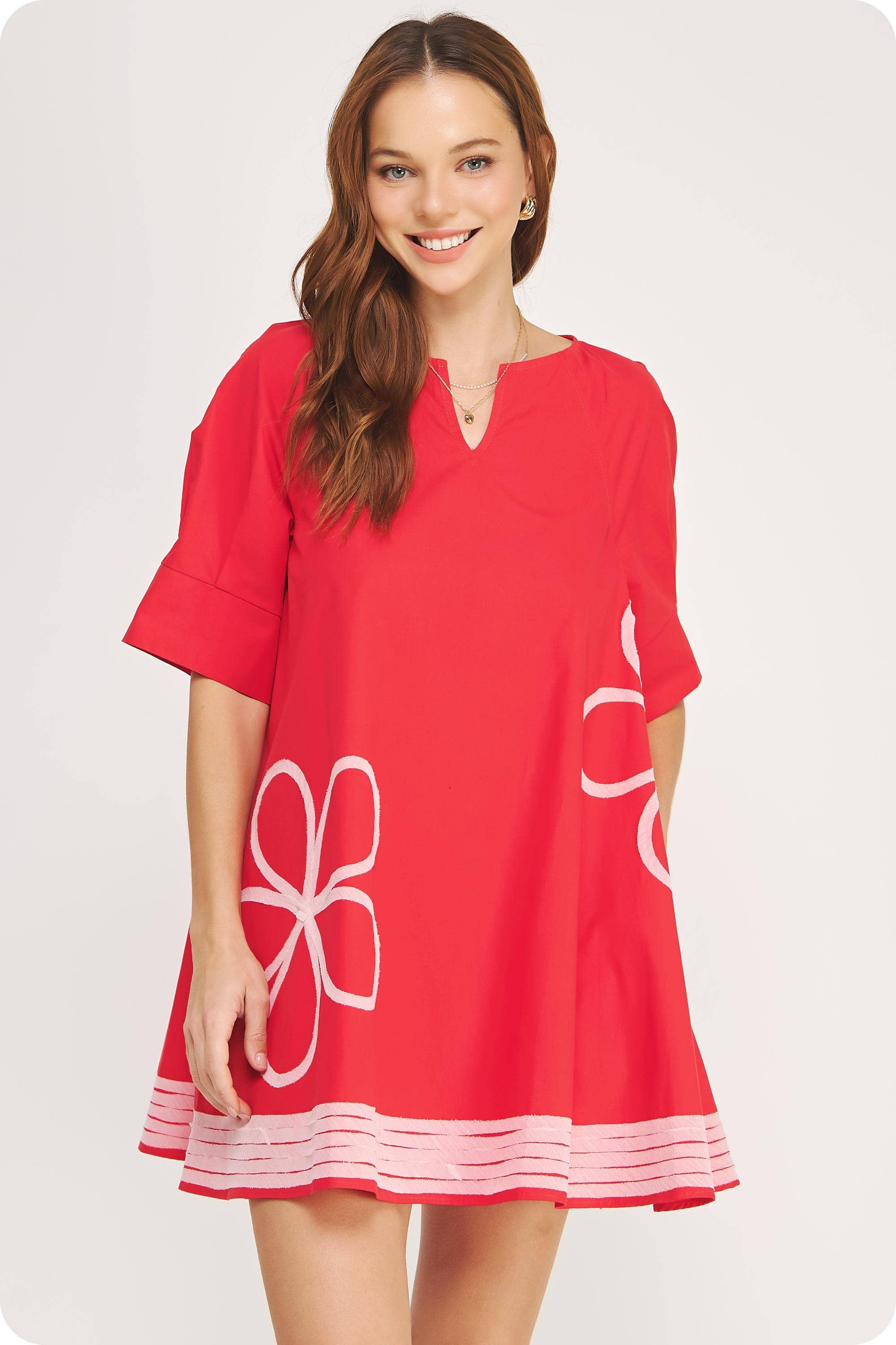 Contrast Frayed Trim Red Flower Detail Poplin Mini Dress