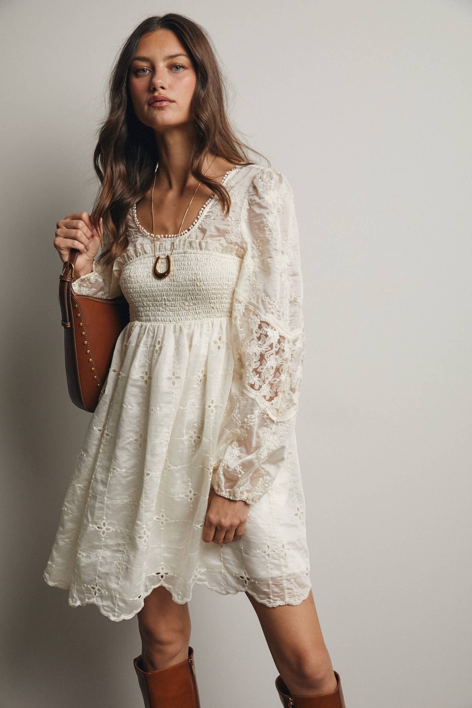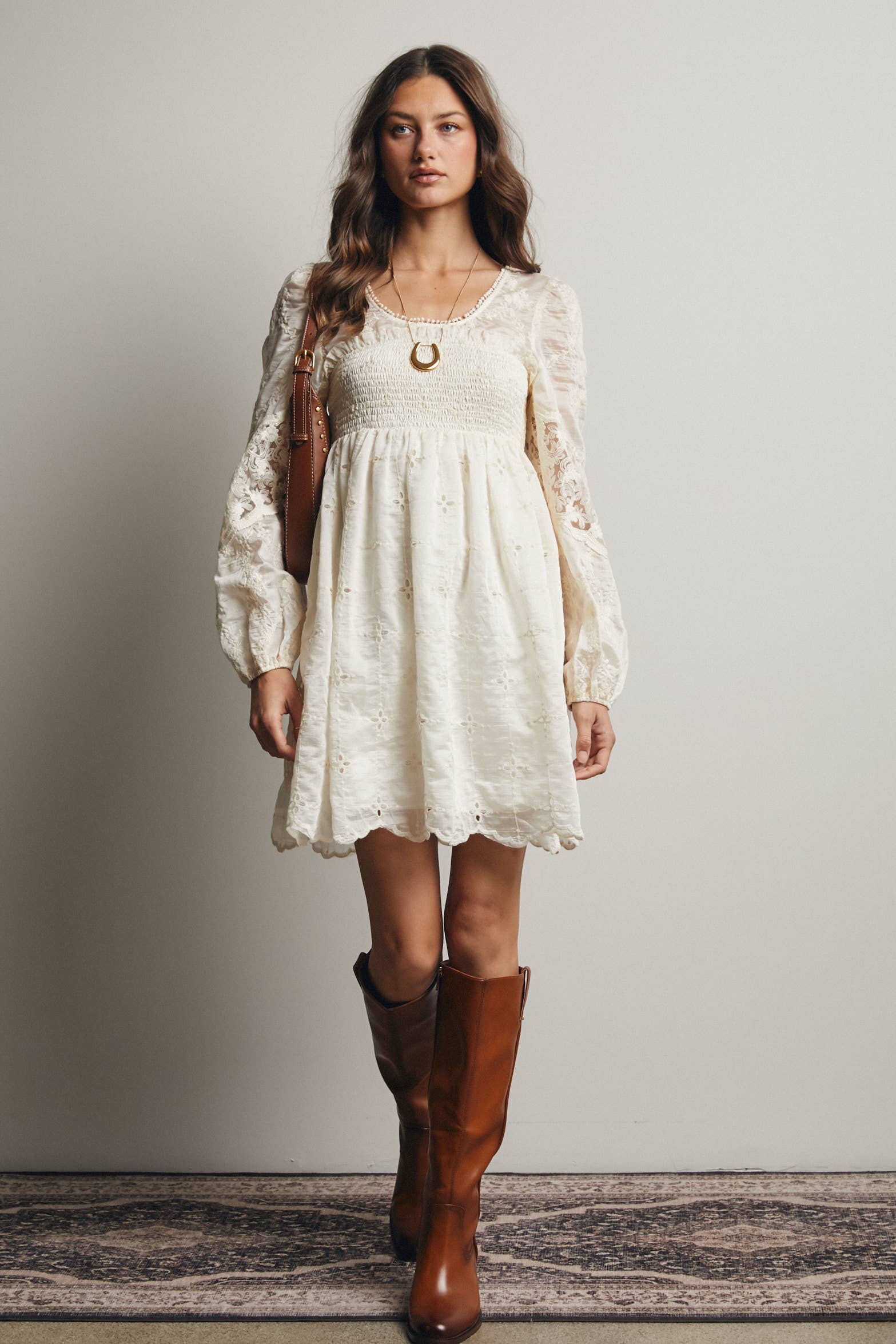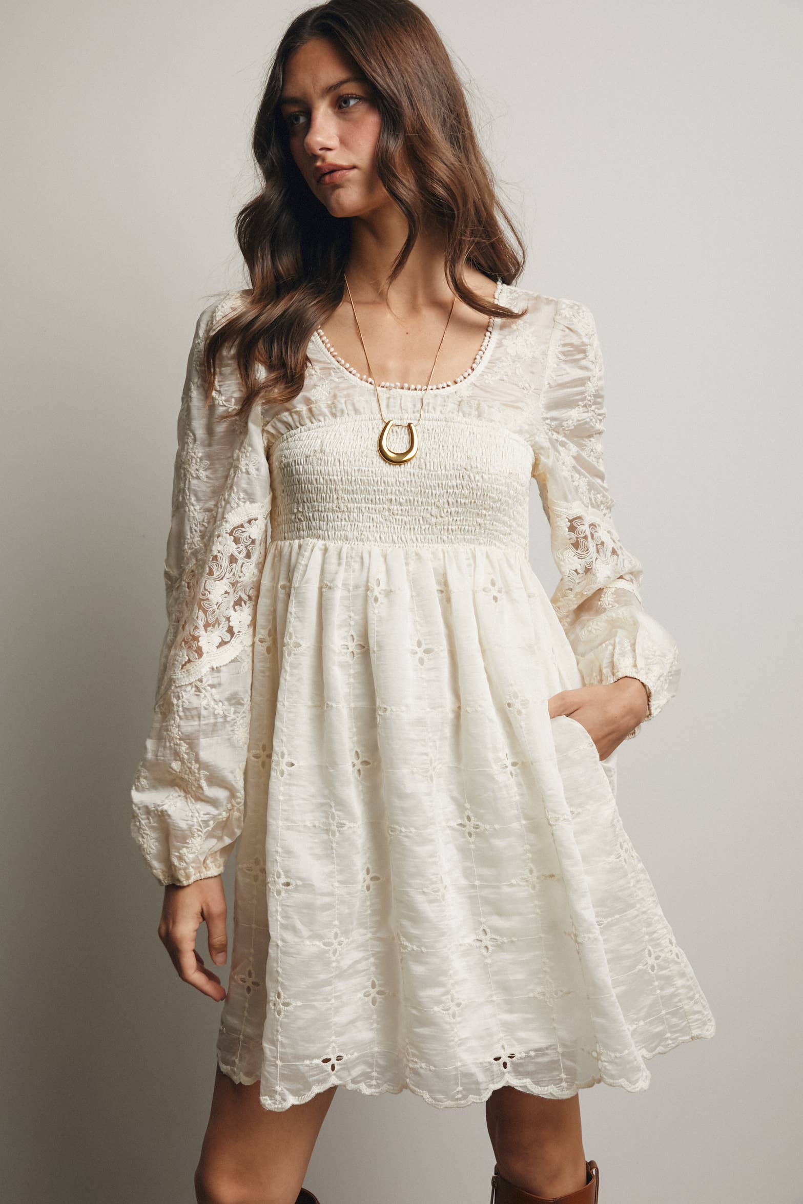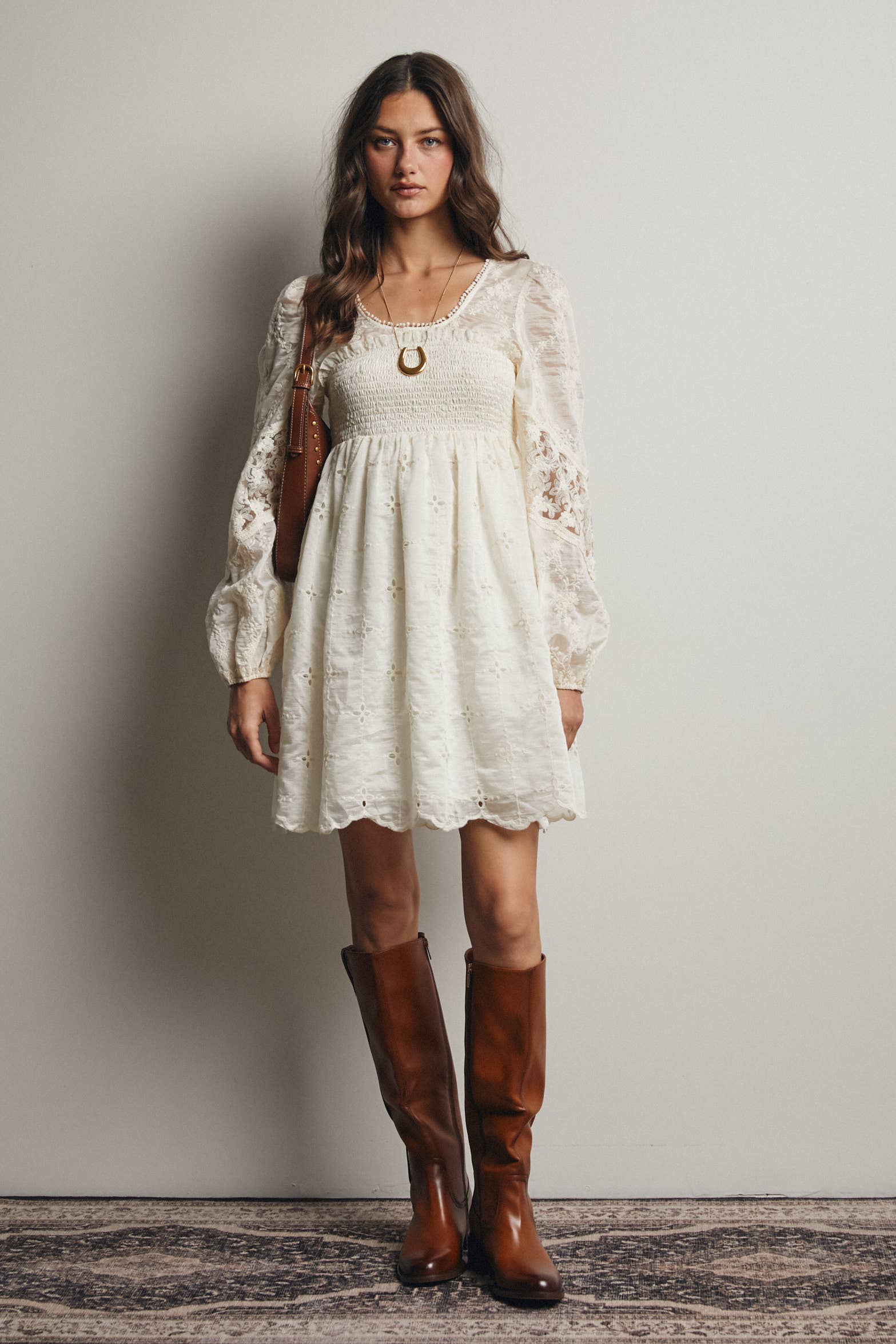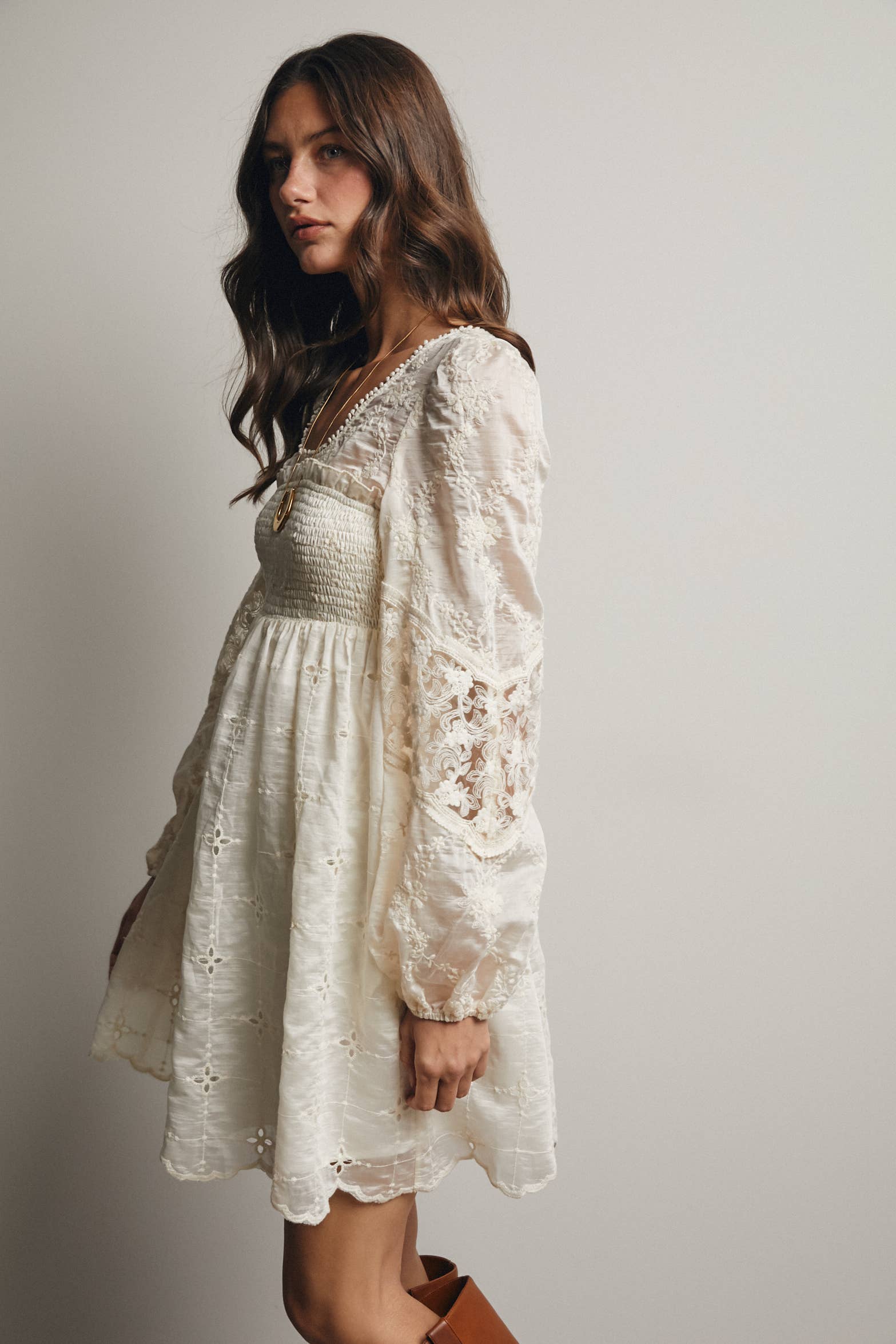 Feminine and timeless, this embroidered lace mini dress blends boho elegance with romantic detailing-perfect for holiday gatherings, seasonal events, or dressed-down with boots for everyday wear.