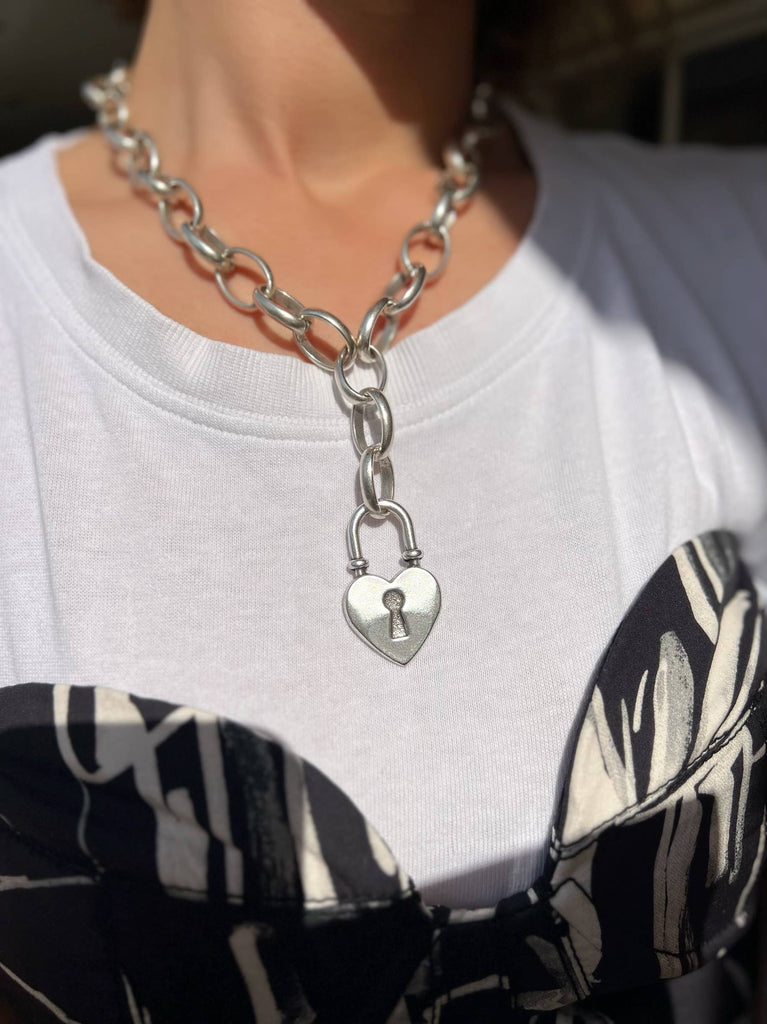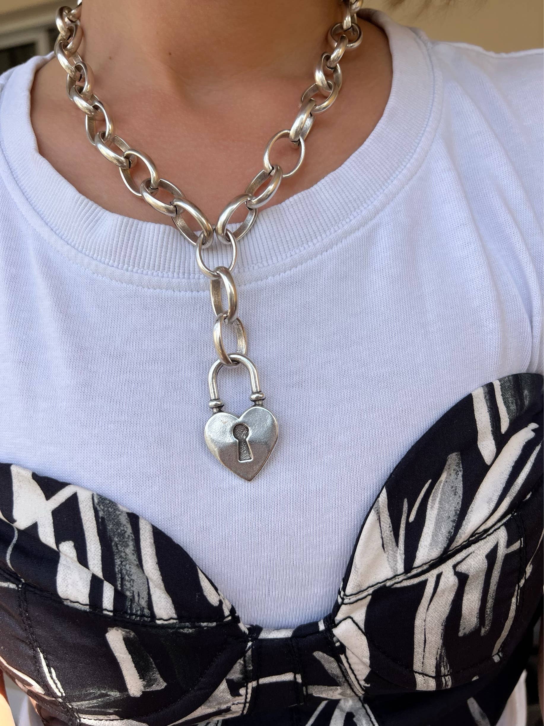 Silver Heart Lock Necklace, Long Heart Necklace, Wide Silver