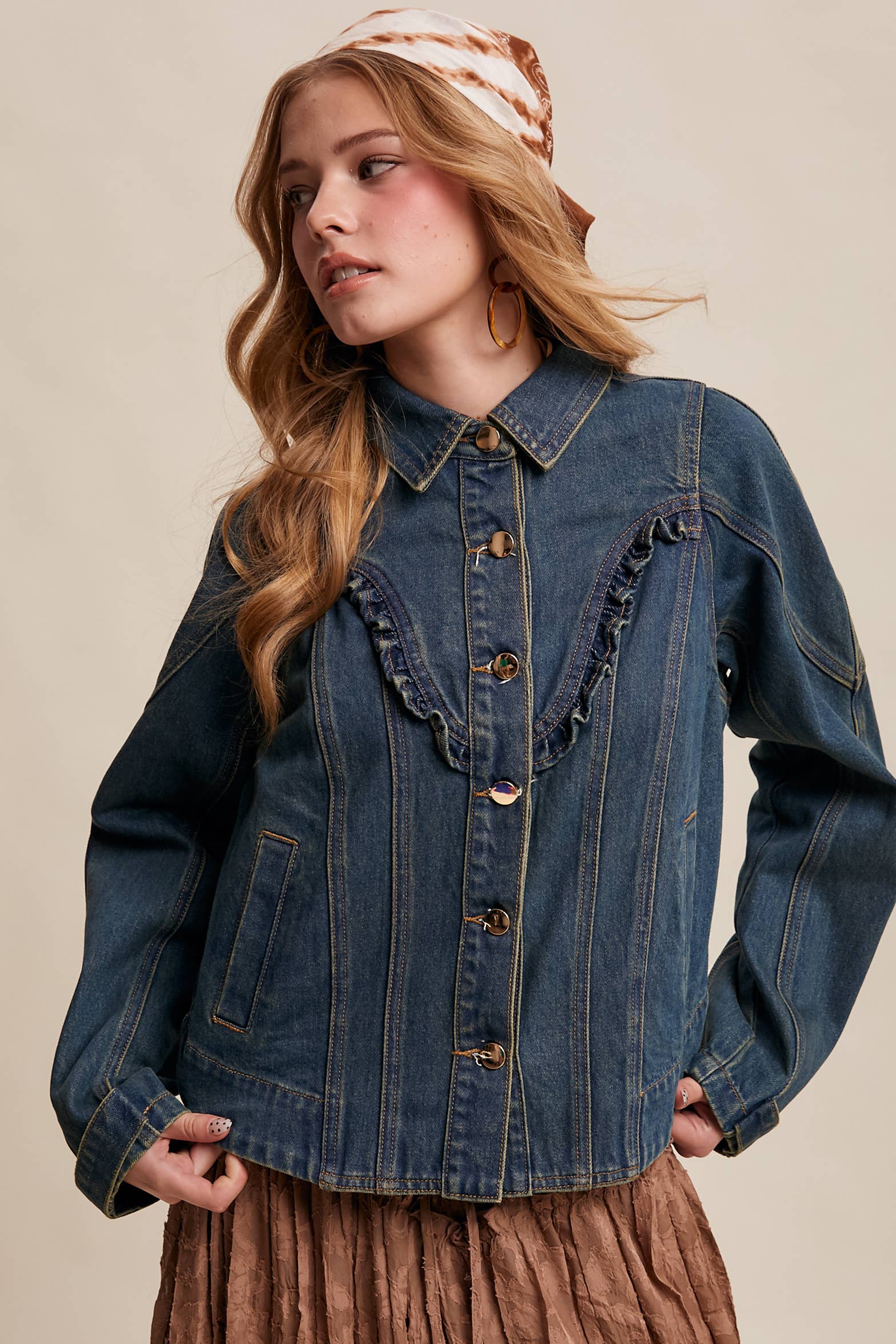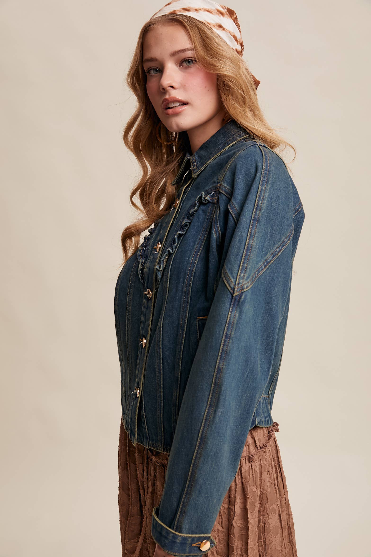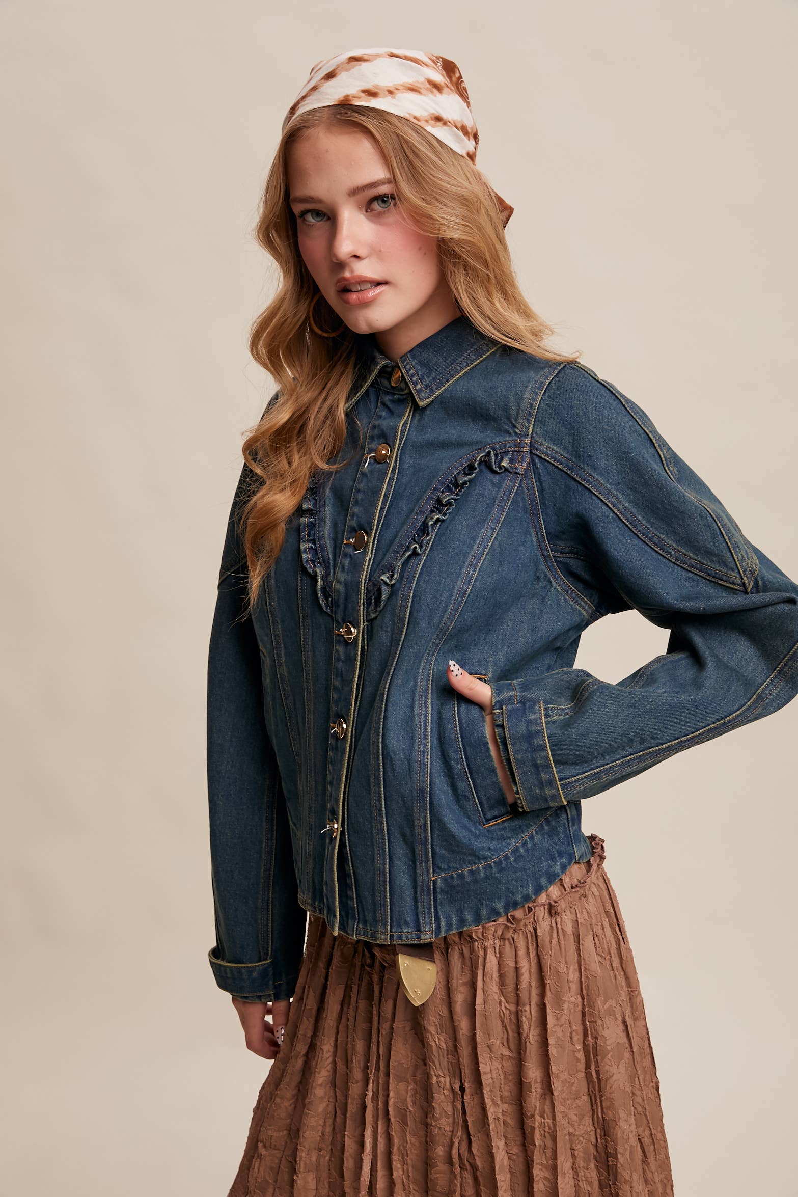 - Durable Cotton Denim: Structured, midweight denim offers a timeless Western feel - Ruffle Yoke Detail: Features a curved front yoke with subtle ruffle trim for feminine contrast - Tailored Silhouette: Paneled body with shaped seams for a flattering, sculpted fit - Functional Front Closure: Classic button-down front with metallic snap buttons - Side Pockets: Discreet welt pockets offer everyday practicality - Western-Inspired Back Yoke.