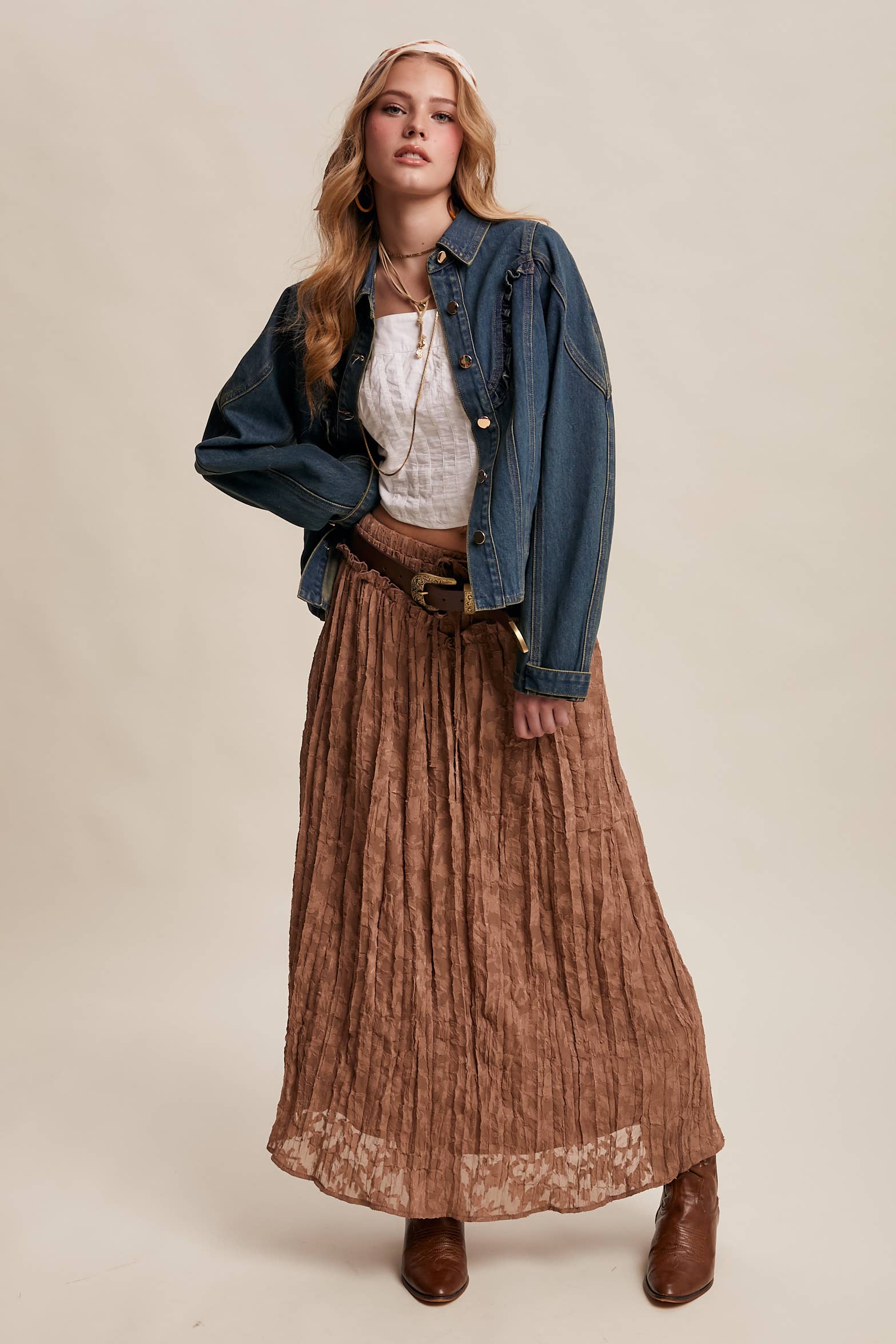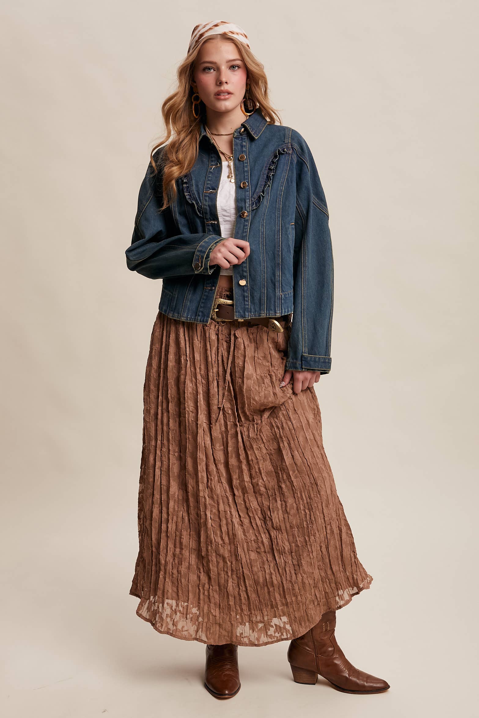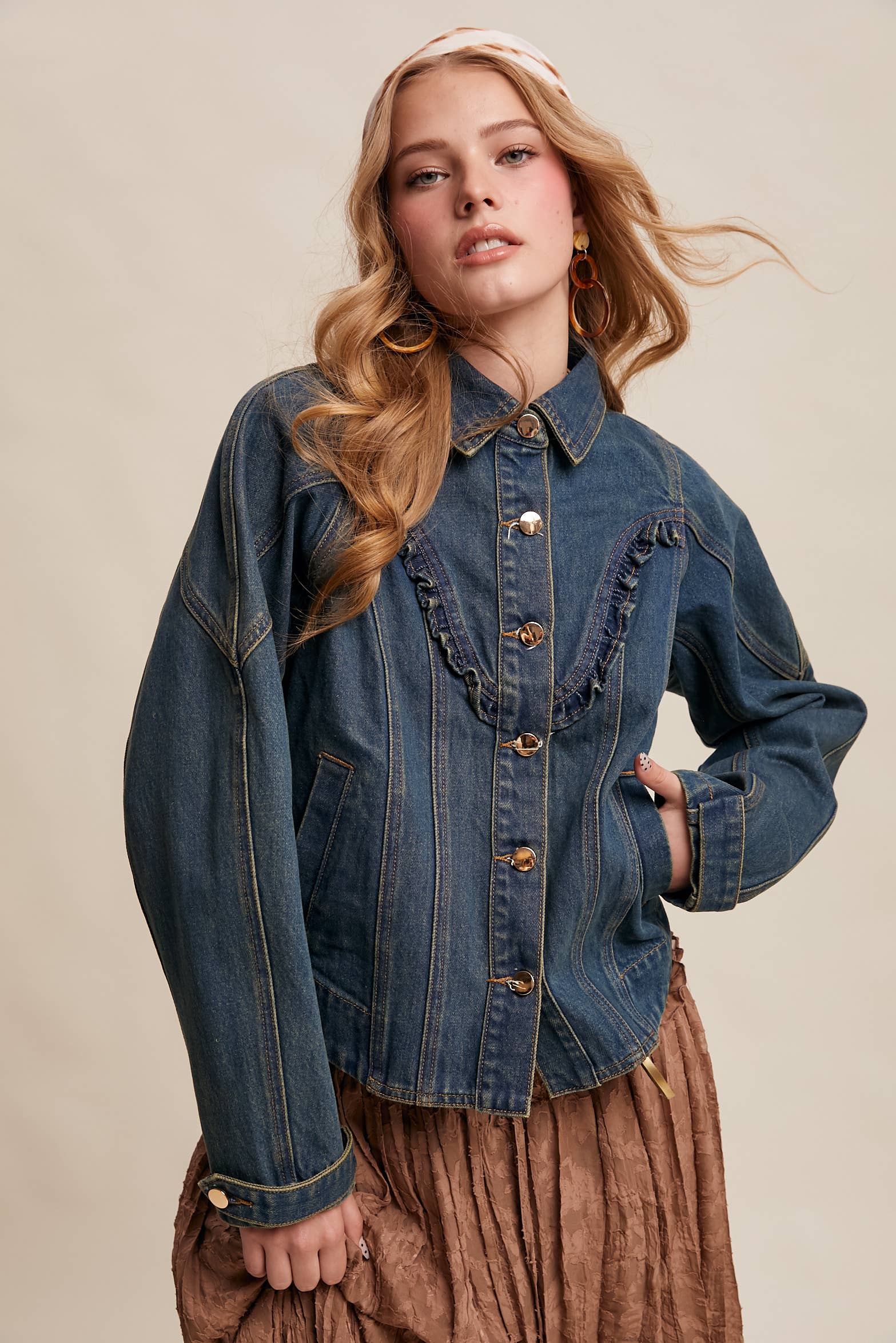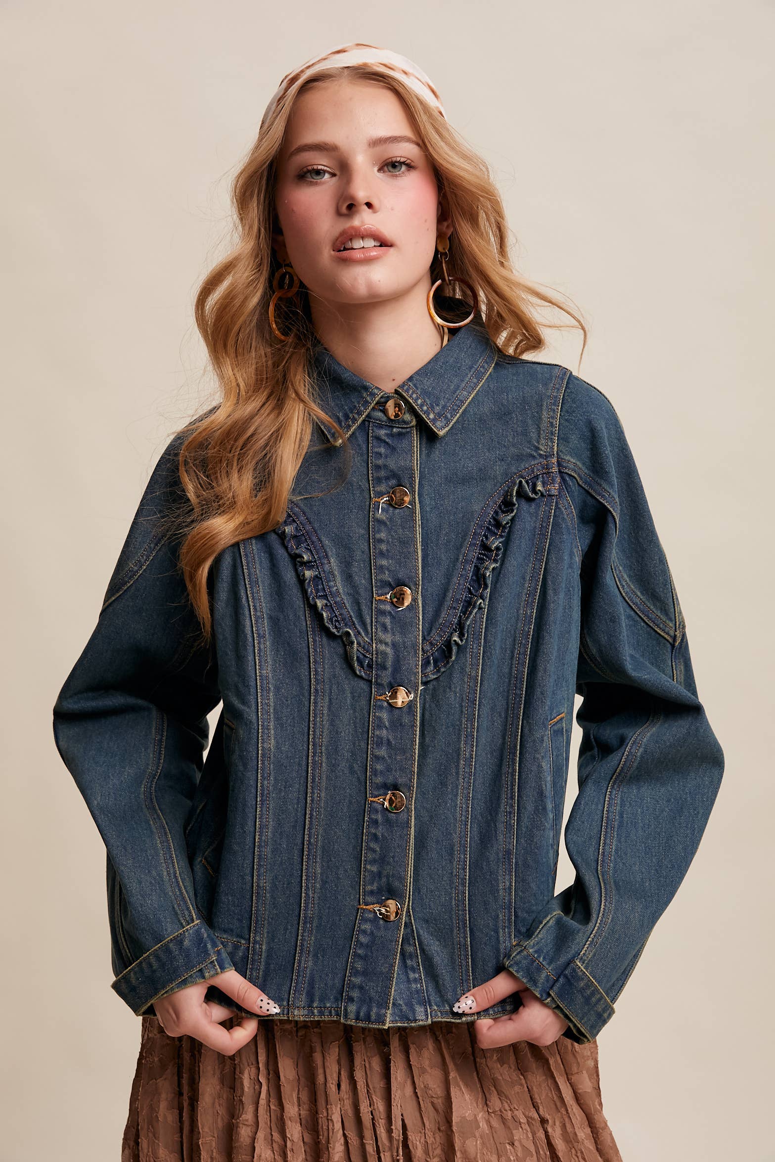 - Durable Cotton Denim: Structured, midweight denim offers a timeless Western feel - Ruffle Yoke Detail: Features a curved front yoke with subtle ruffle trim for feminine contrast - Tailored Silhouette: Paneled body with shaped seams for a flattering, sculpted fit - Functional Front Closure: Classic button-down front with metallic snap buttons - Side Pockets: Discreet welt pockets offer everyday practicality - Western-Inspired Back Yoke.